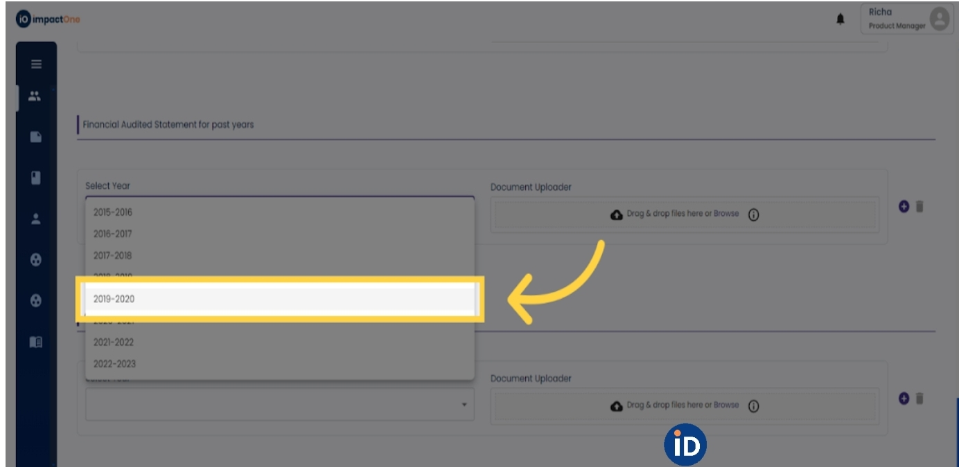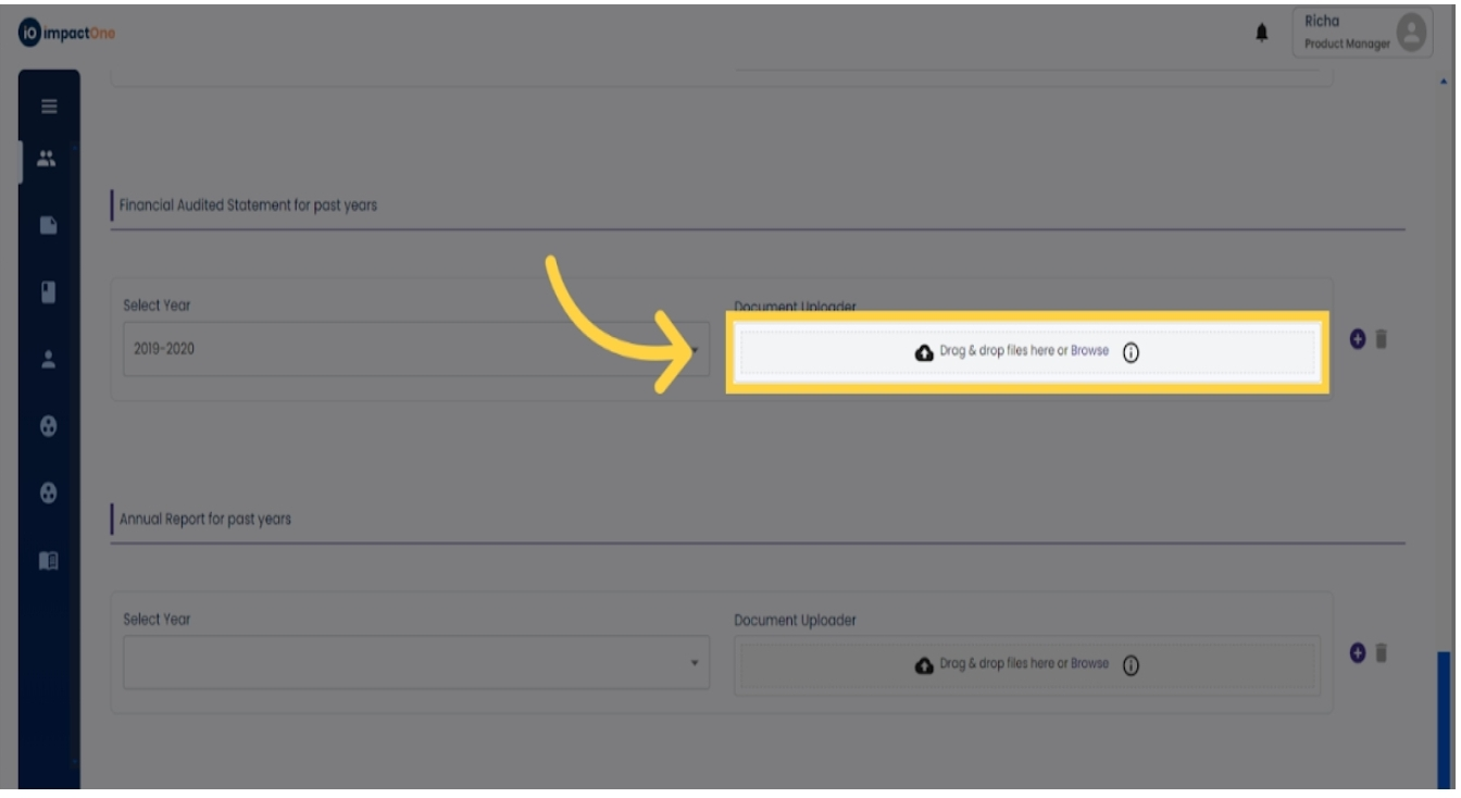 9.Upload Audited Financial Statements: Add the Financial Audited Statements for the past three years. First select the financial year from the drop down, then upload the audited financial statement document. Similarly add for the last three financial years by clicking on the '+' button.