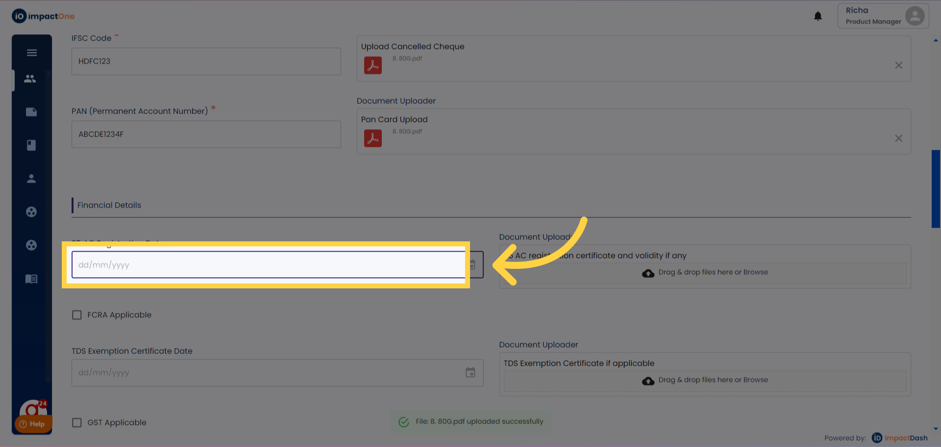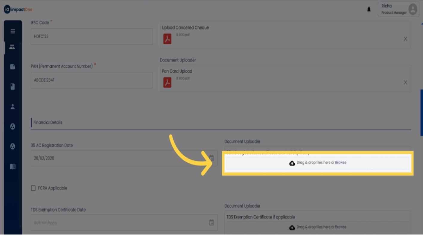 6.Enter Financial Details: Proceed to enter financial details applicable to your organisation. Start with a 35AC certificate, add the date and document for the same.