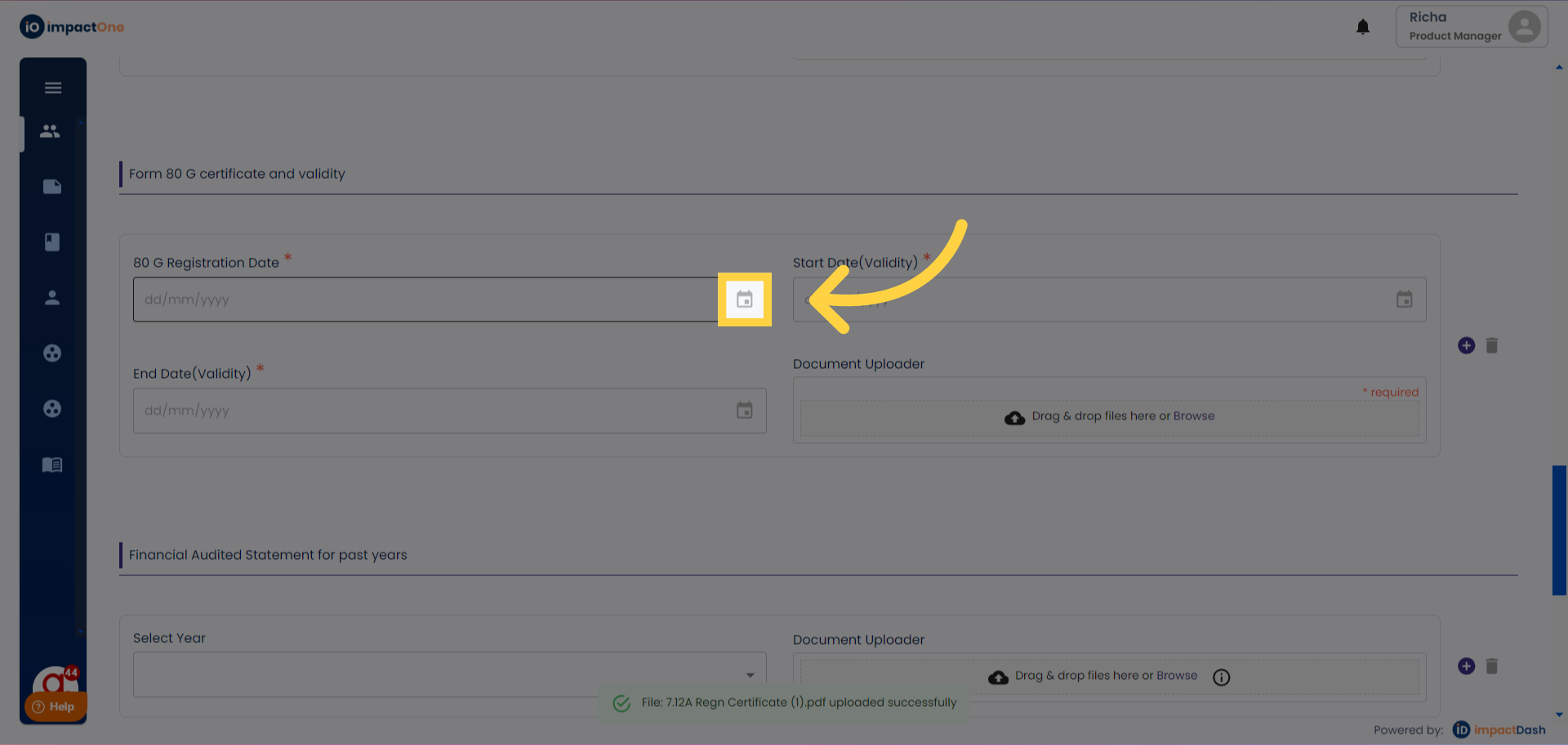 8.Upload 80G Certificate: Similarly, add the 80G certificate document and registration date. And similarly enter the start date and end date for validity of the certificate.