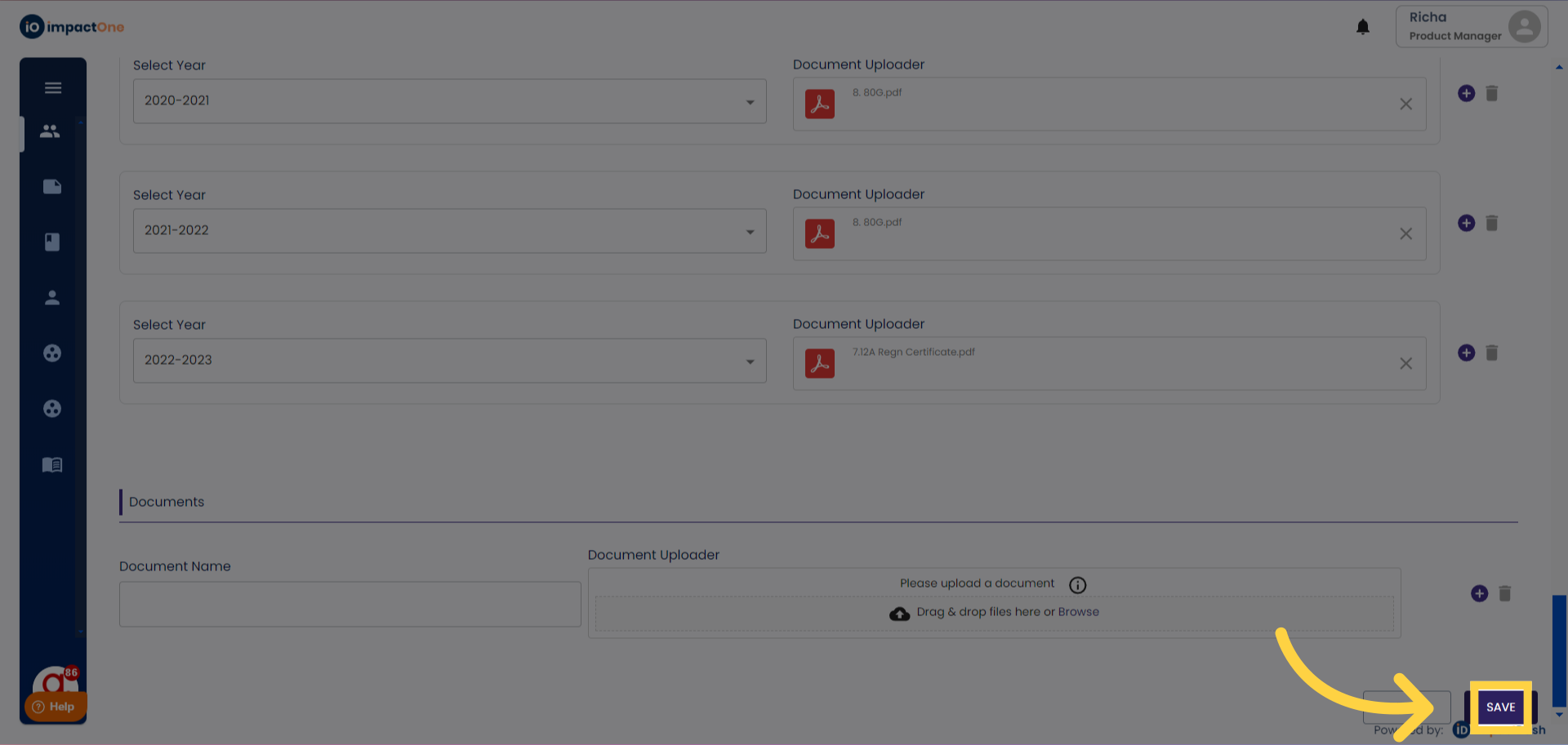11. Documents: Here you can upload any document relevant to the implementer. You can name the document and keep adding multiple by clicking on the '+' button.