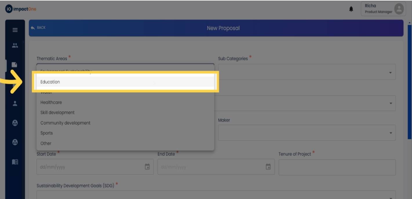 3.Thematic Area Specification: Begin by specifying the thematic area by selecting from the available options in the dropdown menu.