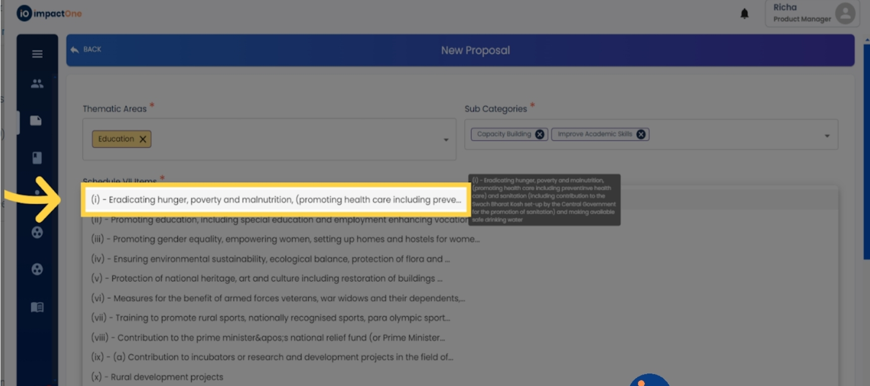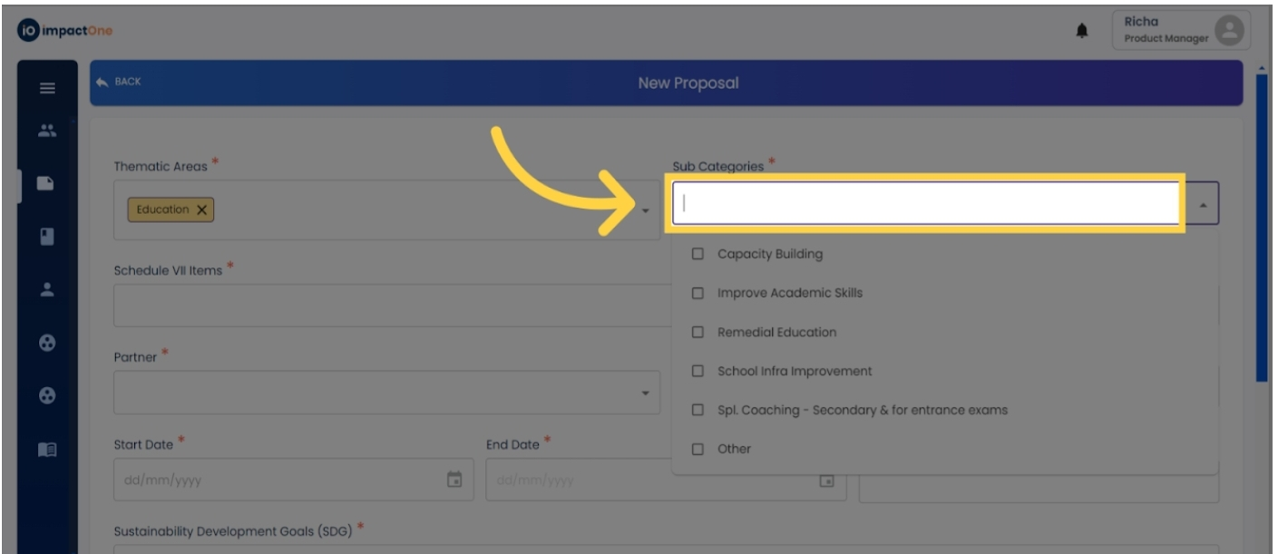 4.Sub-categories Selection: Next, choose the sub-categories relevant to your proposal/project from the dropdown list.