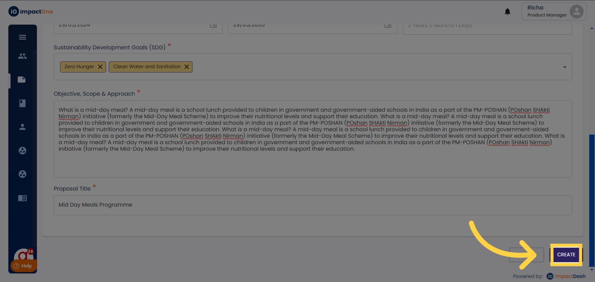 12. Creation Confirmation: Once all information is entered, click on the "Create" button to create the proposal/project and proceed to the next step.