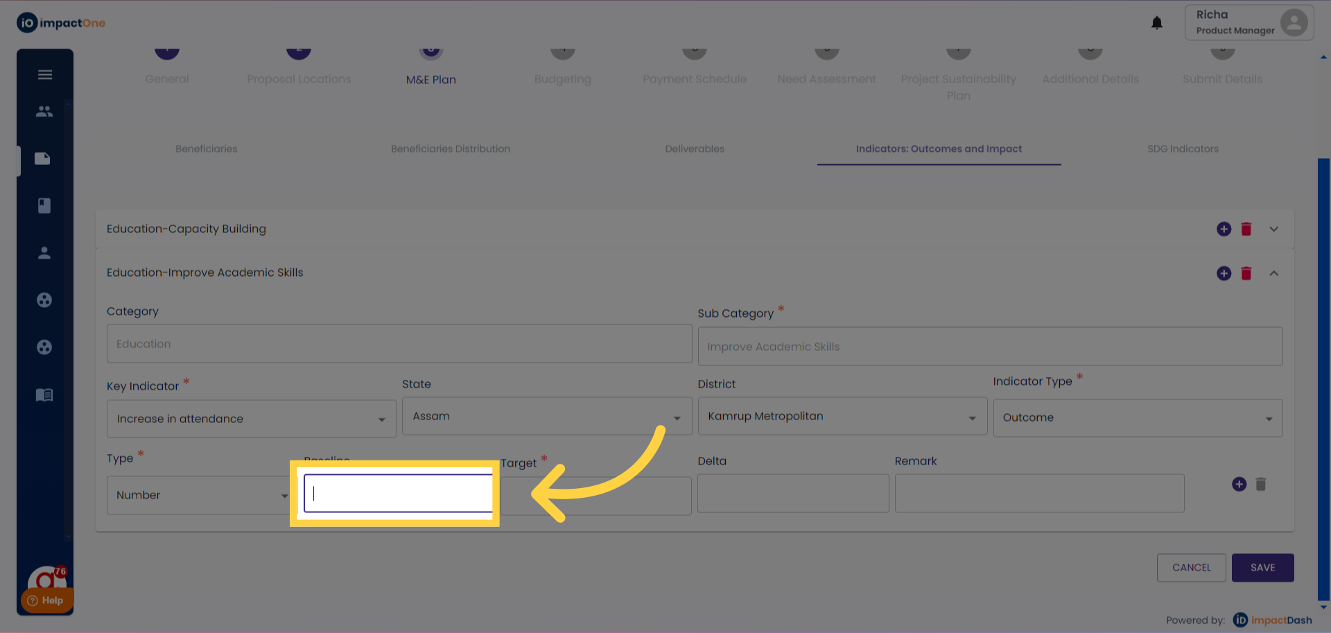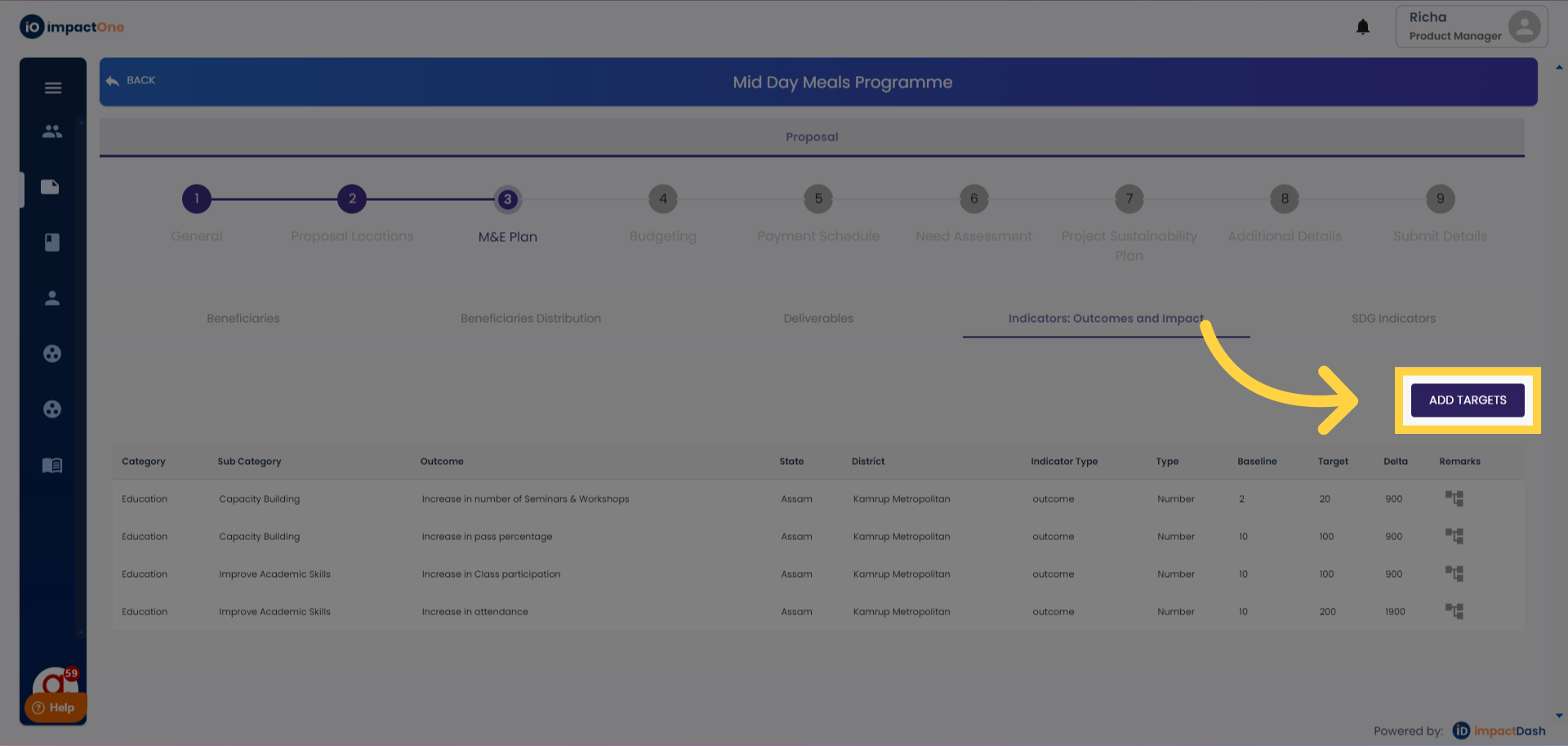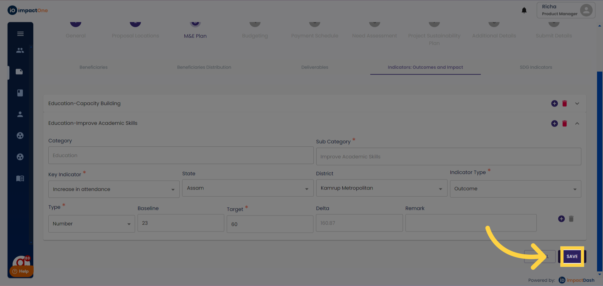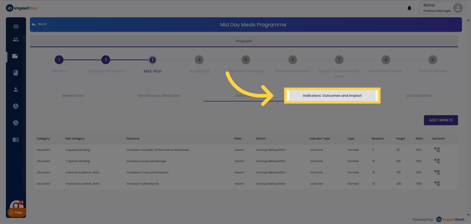 1.Indicators:Outcomes and impact: Navigate to the Indicators: Outcomes and impact tab under M&E plan of the project.