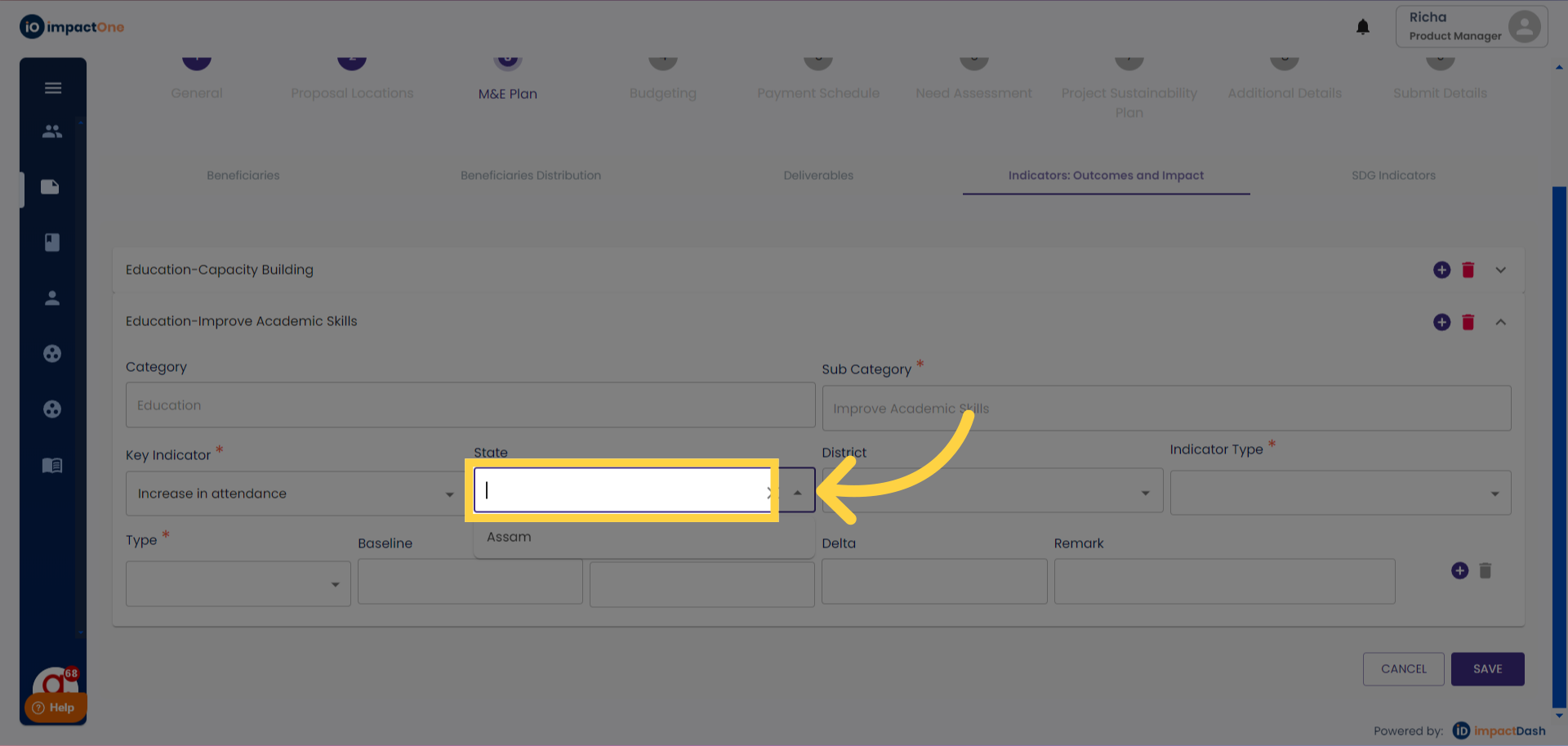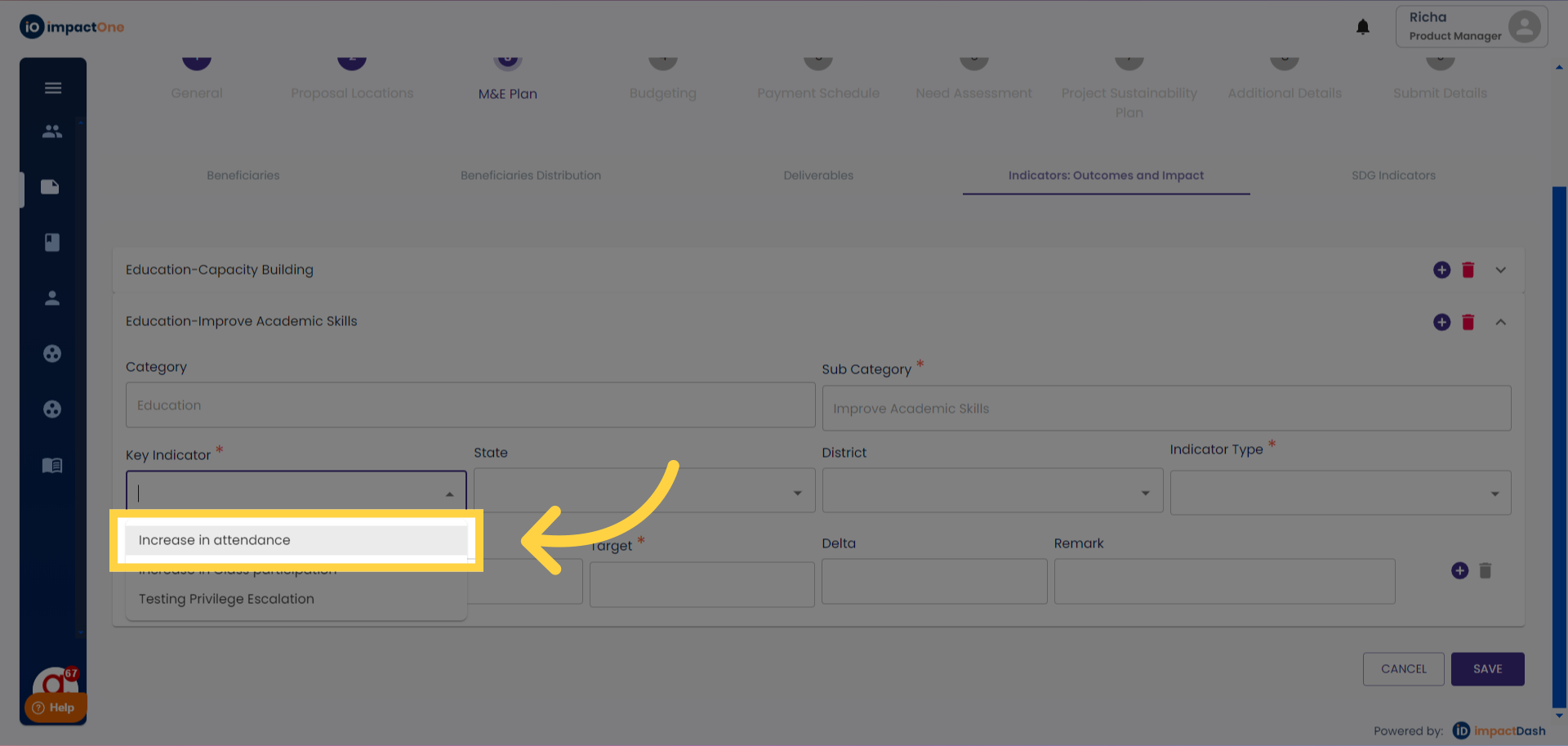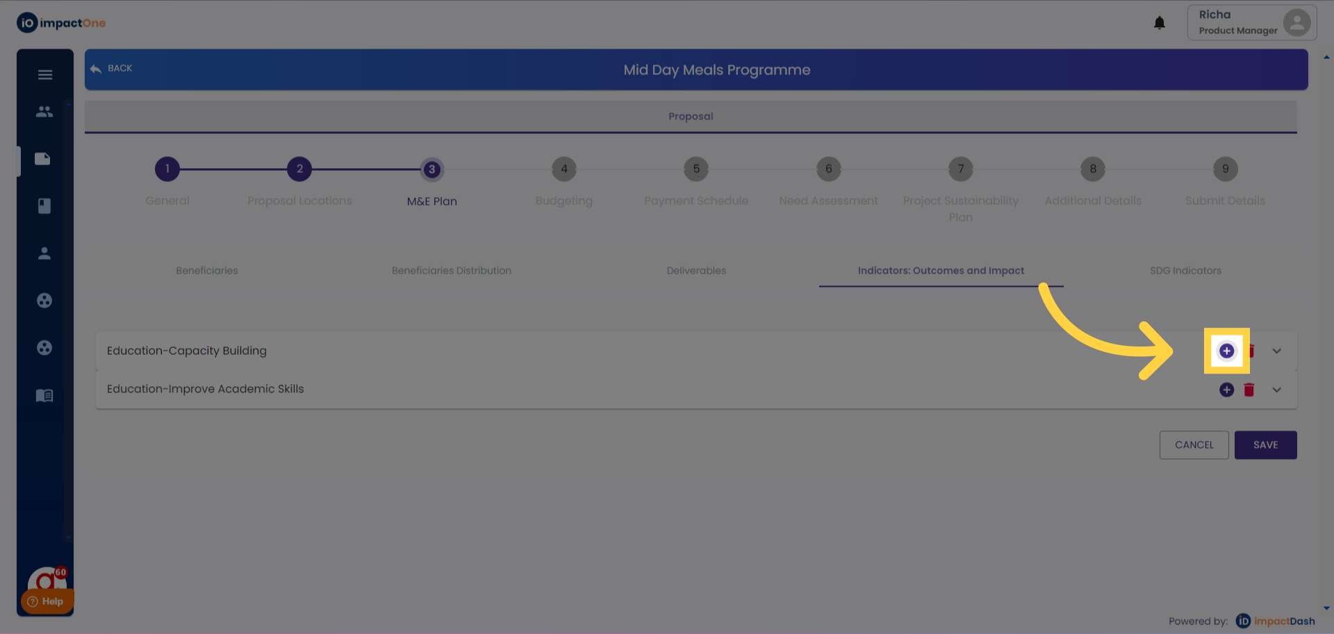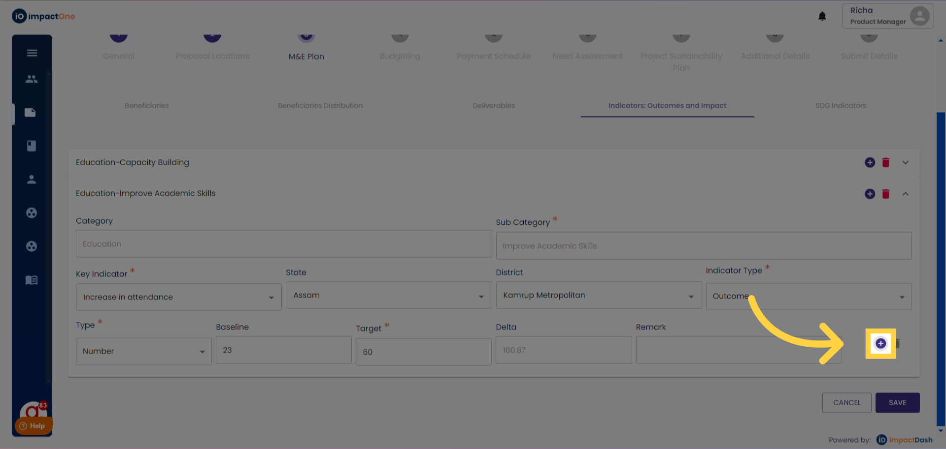 1.Indicators:Outcomes and impact: Navigate to the Indicators: Outcomes and impact tab under M&E plan of the project.