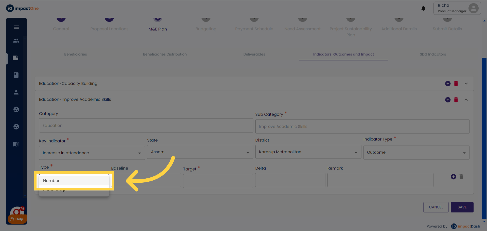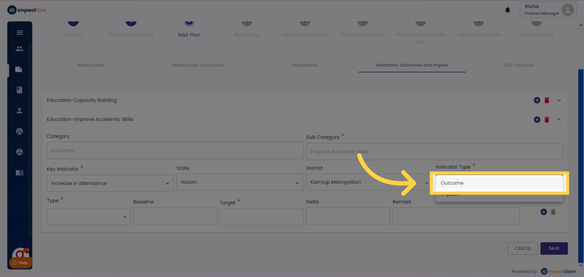 6.Indicator type: Select the indicator type : Outcome/ Impact from the drop down menu.