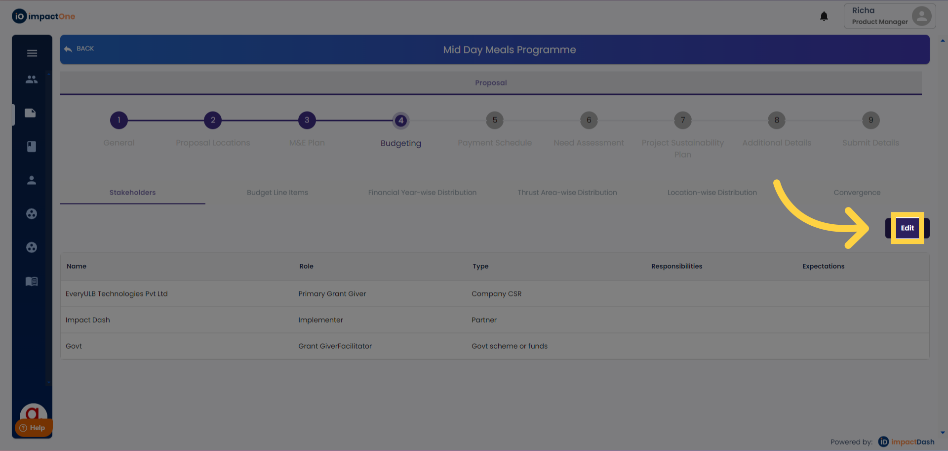 1.Start Editing: Click on the "Edit" button to begin. The default stakeholders are the Funder (Primary grant giver) and the Implementing Agency (Implementer).