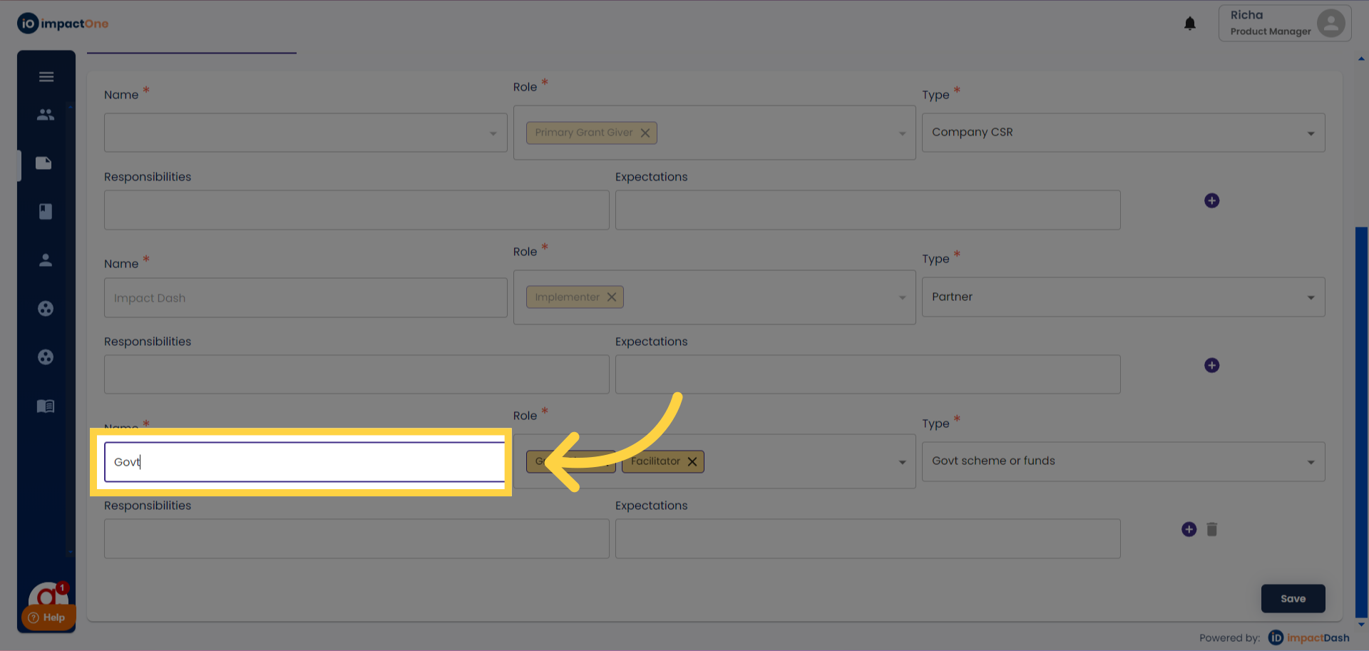 3.Saving and Proceeding: Click on the "Save" button after adding stakeholders and proceed to the next section.