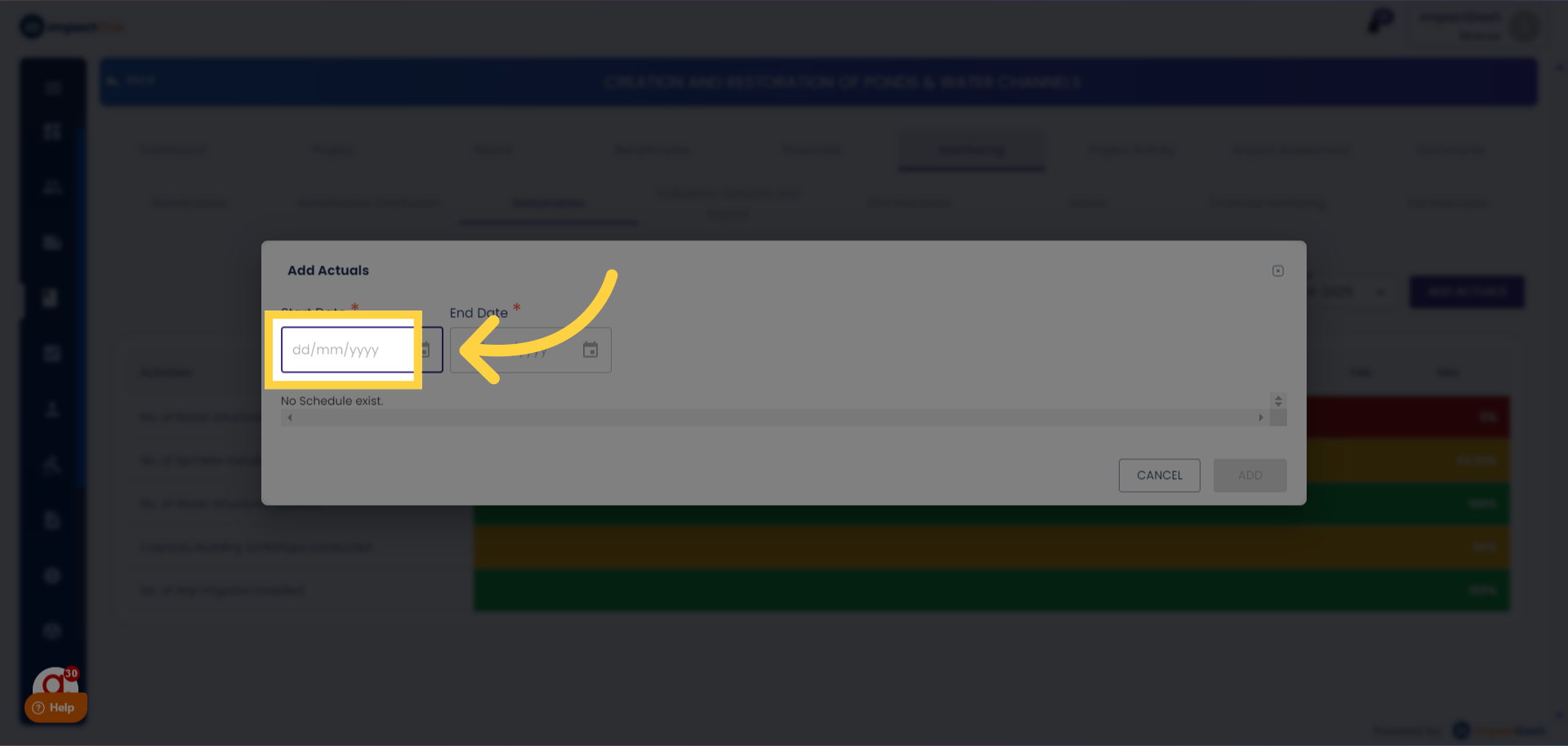 3.Setting Project Dates: Select the start date and end date of the project and click on 'ADD'.