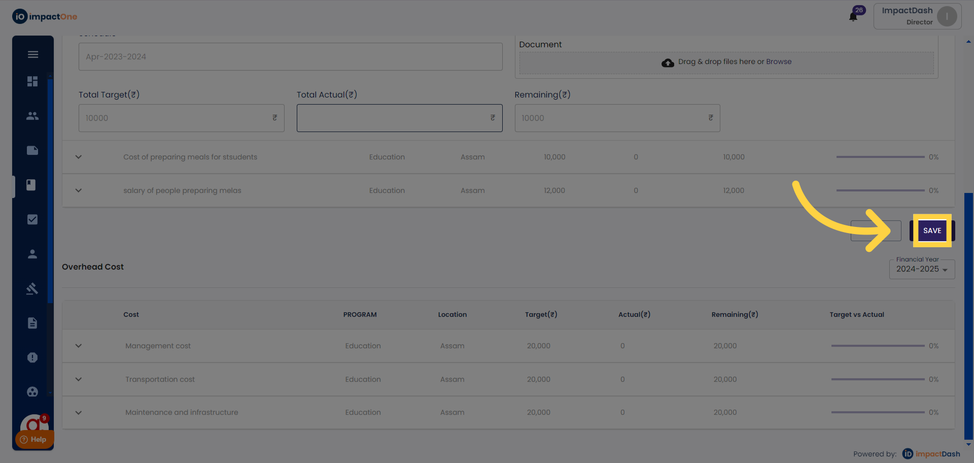 5. Save: Click on 'save' to confirm the actuals entered.