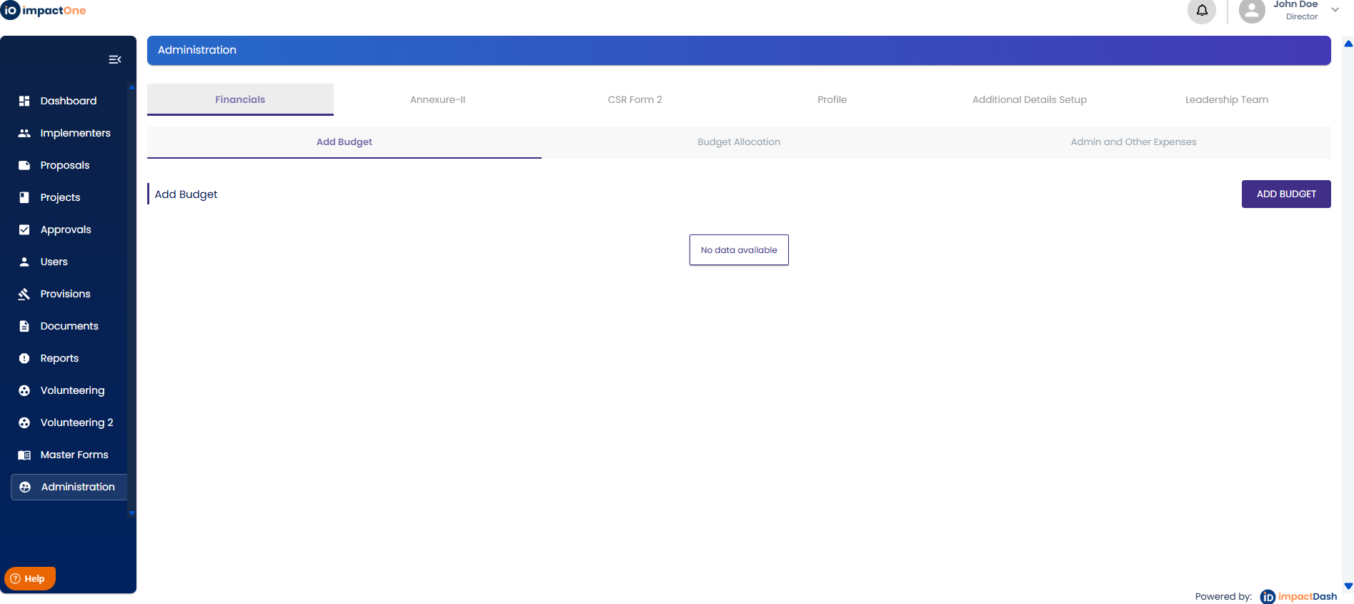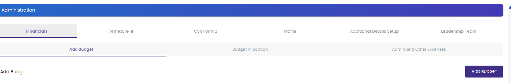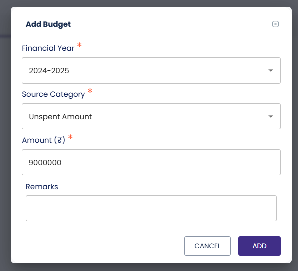 Create a new CSR budget for the financial year. Under the 'Add Budget' section, enter the unspent amount to record the funds carried forward from the previous year.