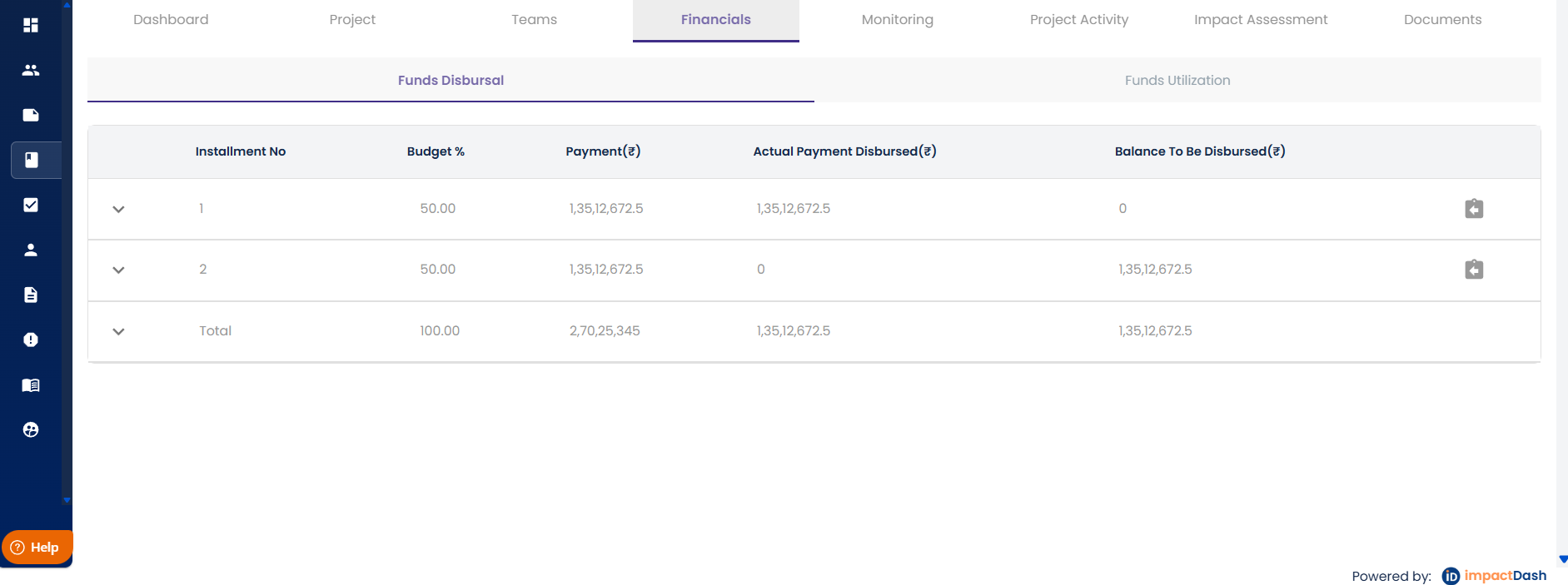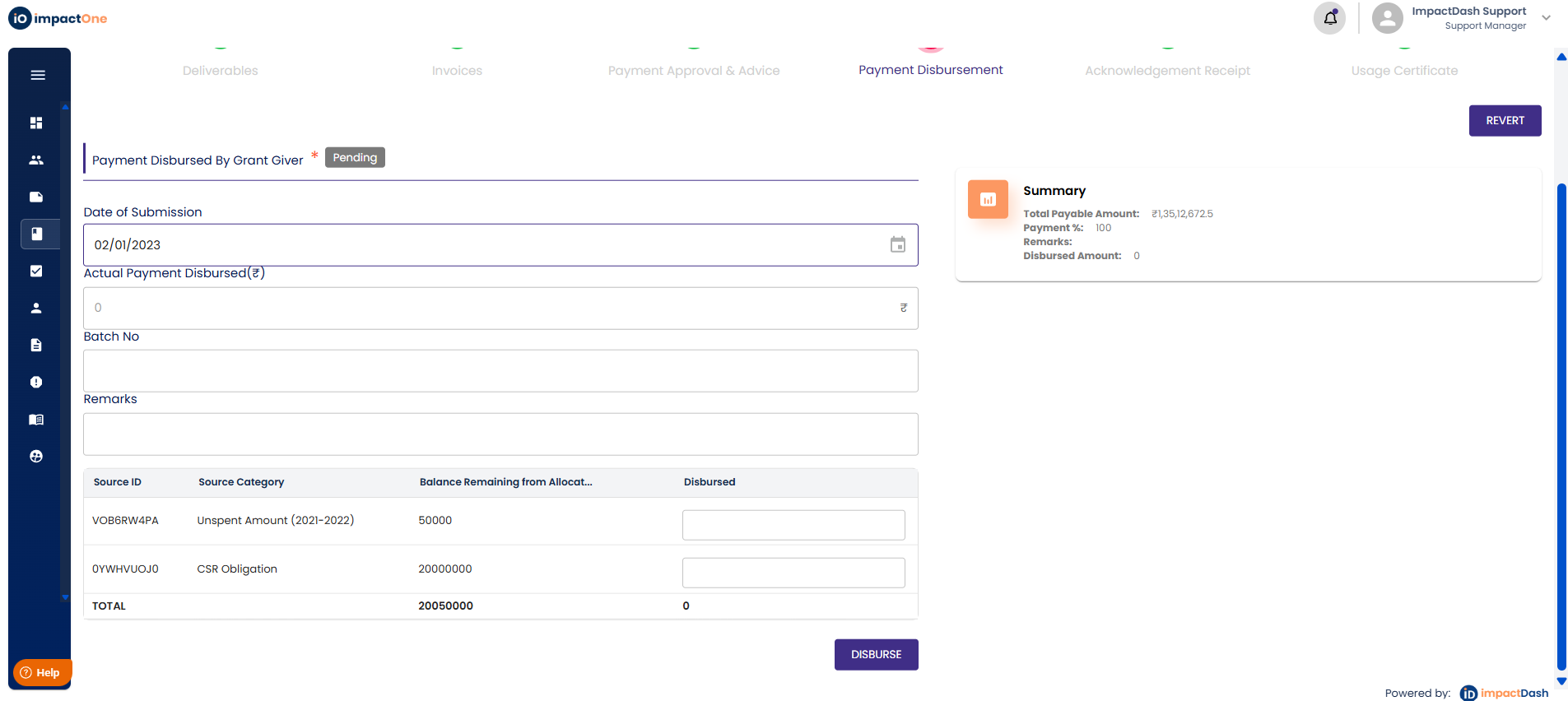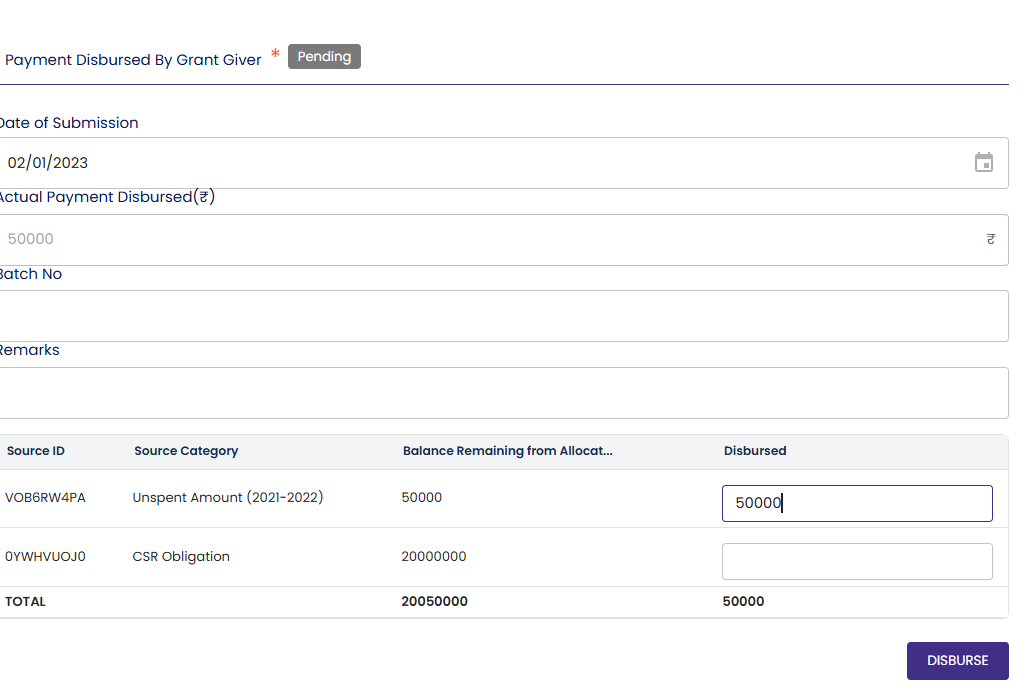 In the instalment section, the checker will have the option to disburse funds from the source category which is either the ' CSR Obligation' or 'Unspent Amount' from the previous years.