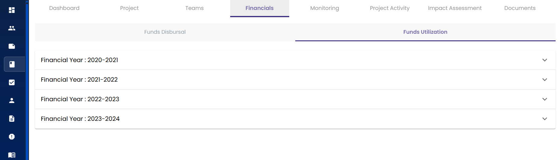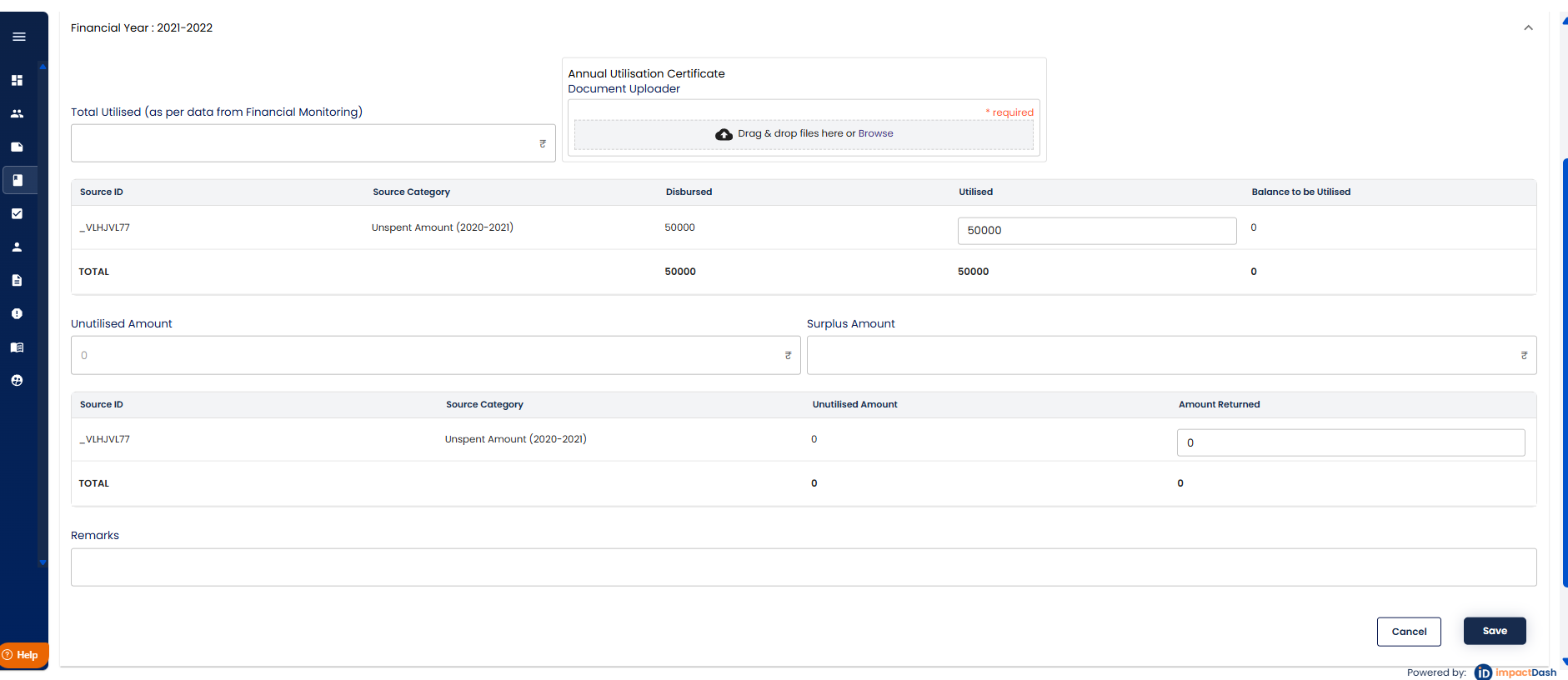 b) Select the financial year you want to enter the utilization for and enter the utilized amount, along with the utilization certificate document and the other details like the surplus and return (if applicable) and save.