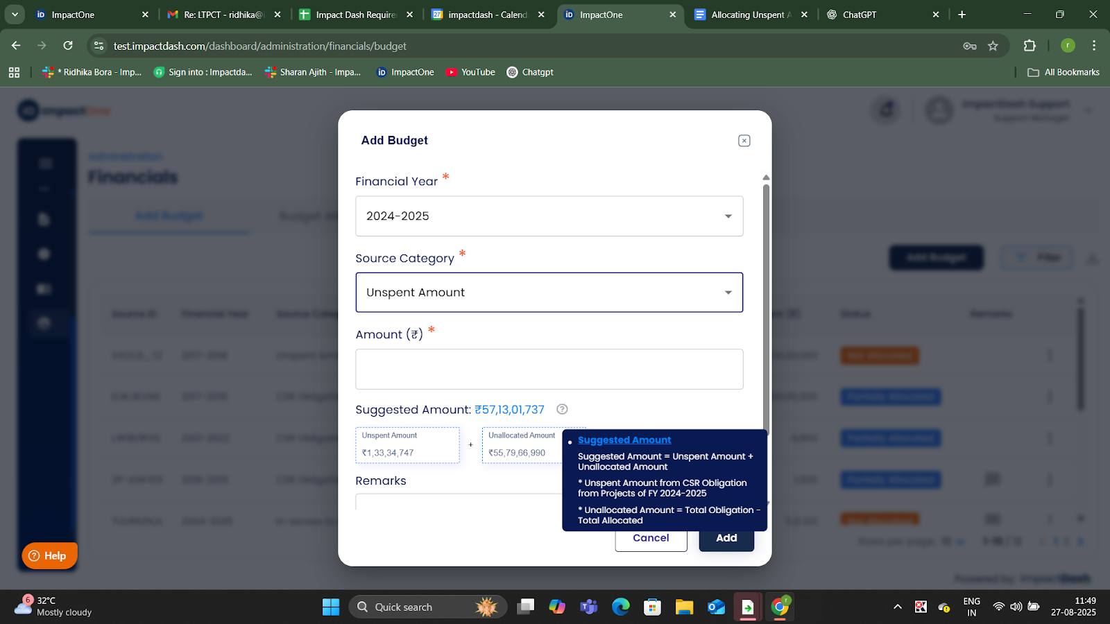 Add Budget: Click on ‘Add Budget’.A pop-up window will appear prompting you to fill in the budget details.In the pop-up, choose the ‘Unspent Amount’ as source category.