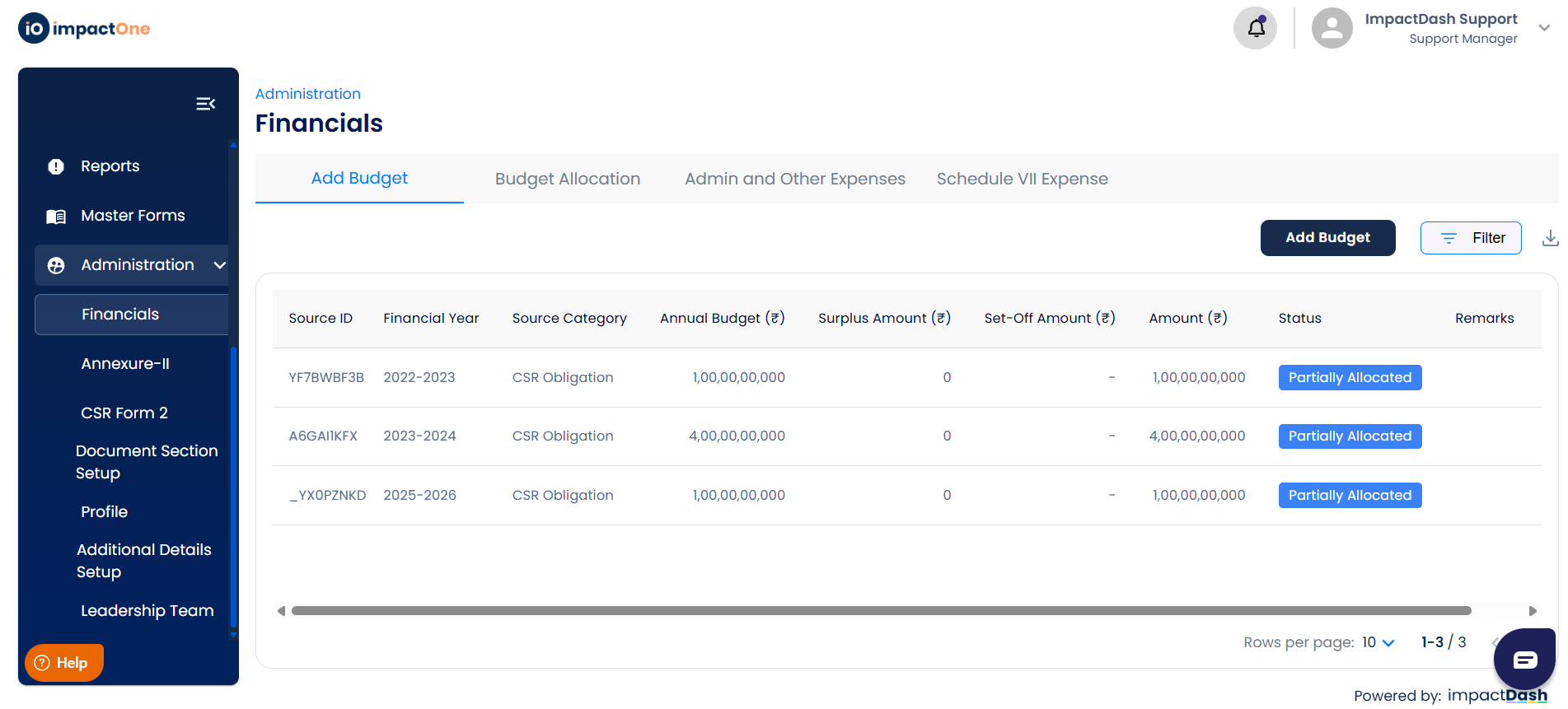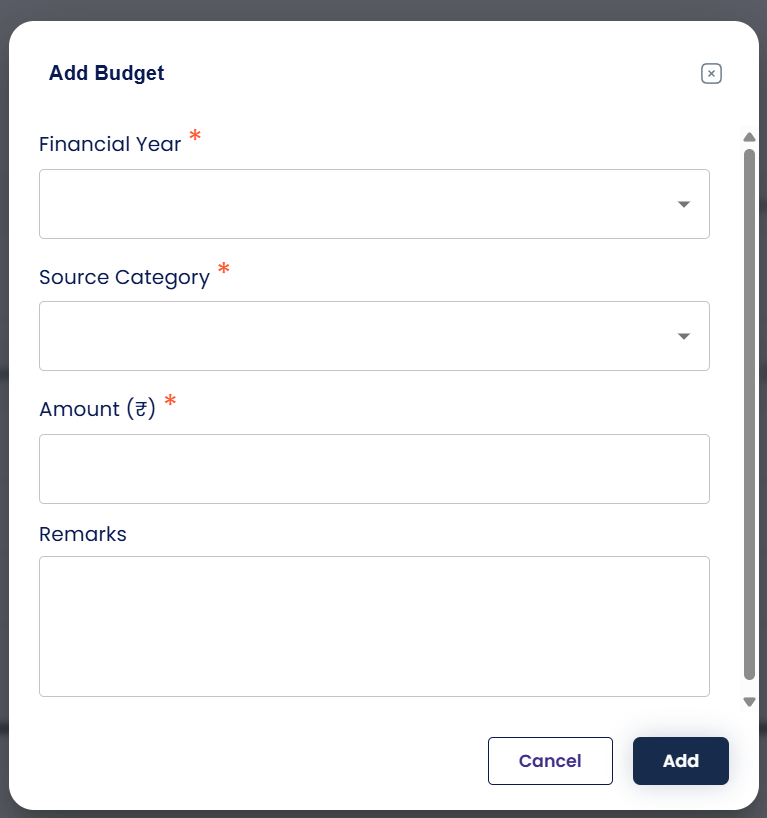 Step1. For add budget, we need to add the budget of the annual financial year, click on add budget button on the right side a pop up appears, fill in the details and add the budget details and save it. Here the budget can be of three types. CSR obligation, unspent amount and in excess to CSR obligation.