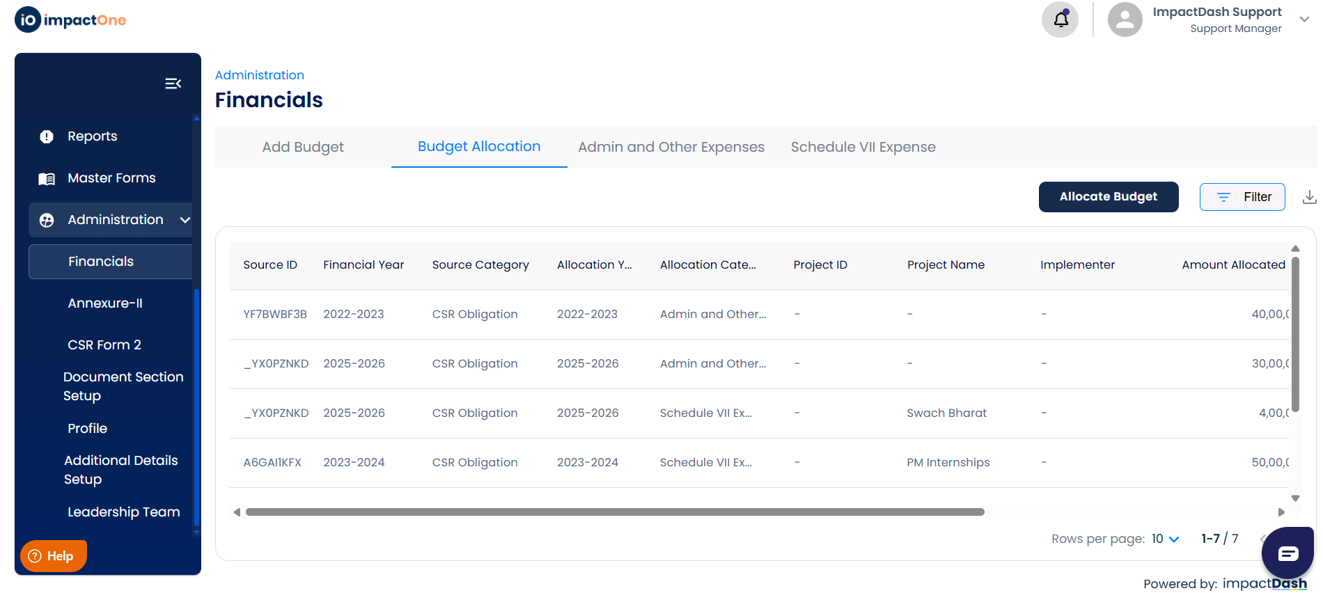 There are different sections inside financials, the add budget, budget allocation, admin and other expenses and schedule vII expenses.